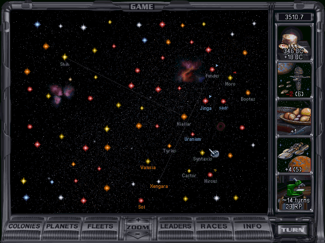 3512.5-3513.8: Keep on building colony ship and frigates while researching in short order fusion beam, tachyon communication and atmospheric renewer.